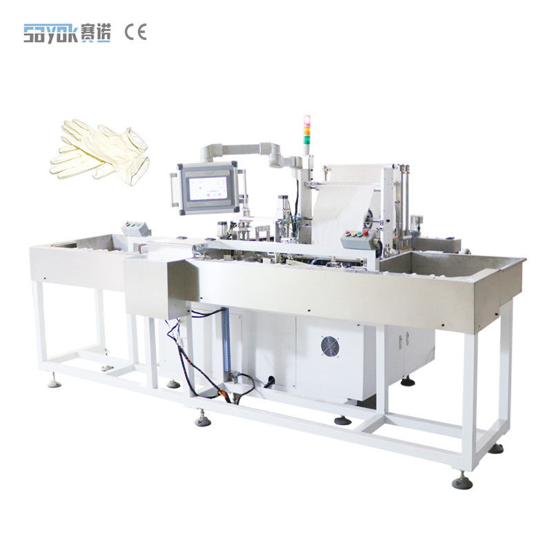 The inner lining paper film is put on the shelf→paper feeding film--precise cutting film--paper-absorbing film to the packaging area--manipulator picking up gloves--glove positioning and placement--paper mold folding--packing completion--Output